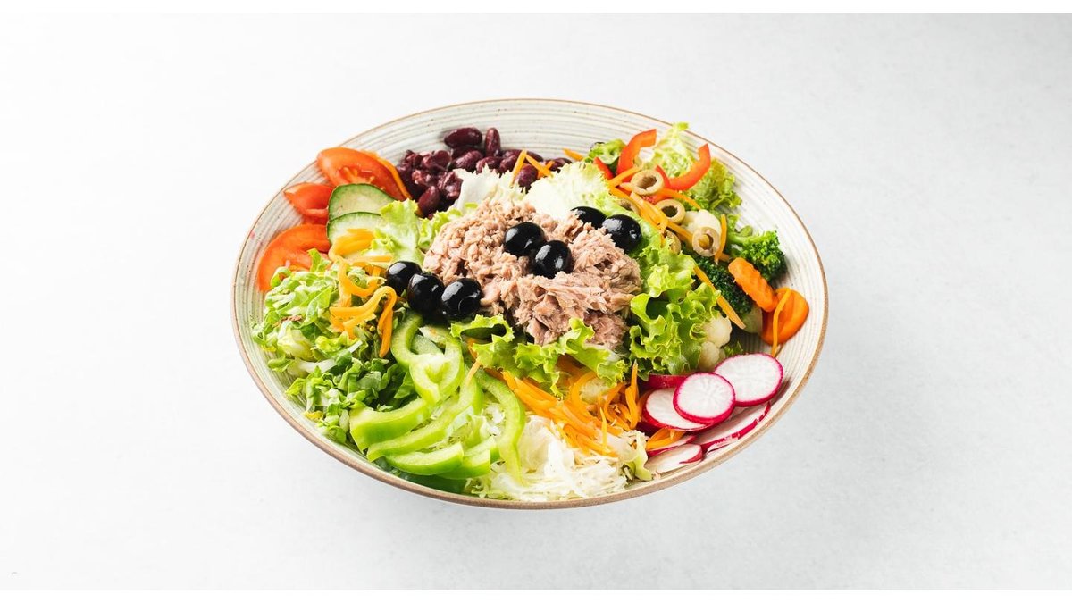 Ton, ouă, salată iceberg, roșii, ceapă roșie, morcovi, măsline, lămâie. 400 g