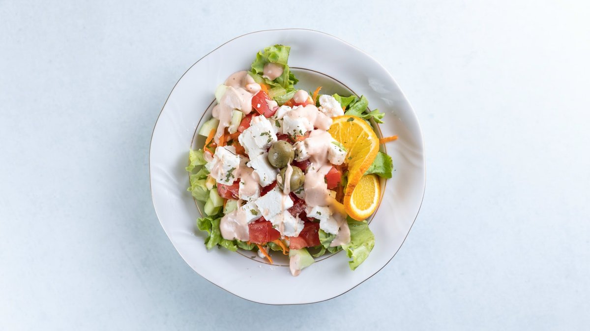 Salată iceberg, roșii, castraveți, măsline, ardei gras roșu, ceapă roșie, brânză feta 400 g