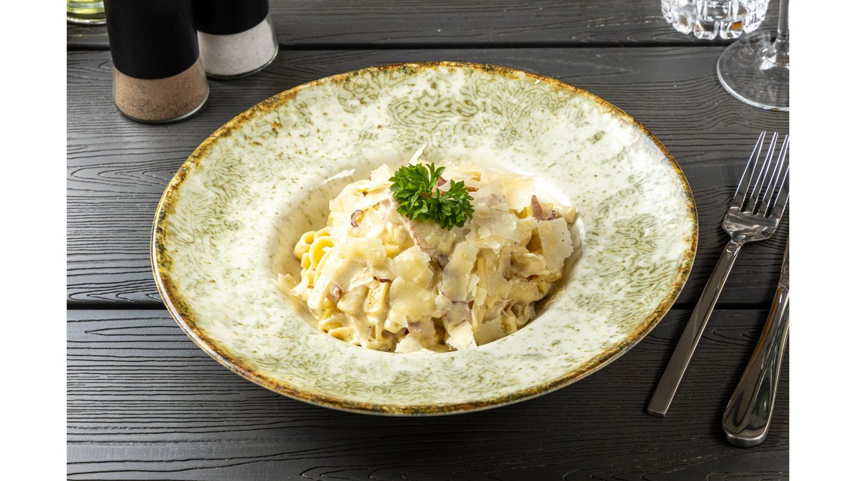 Penne, smântână, bacon, ou, parmezan, unt. 300g.
