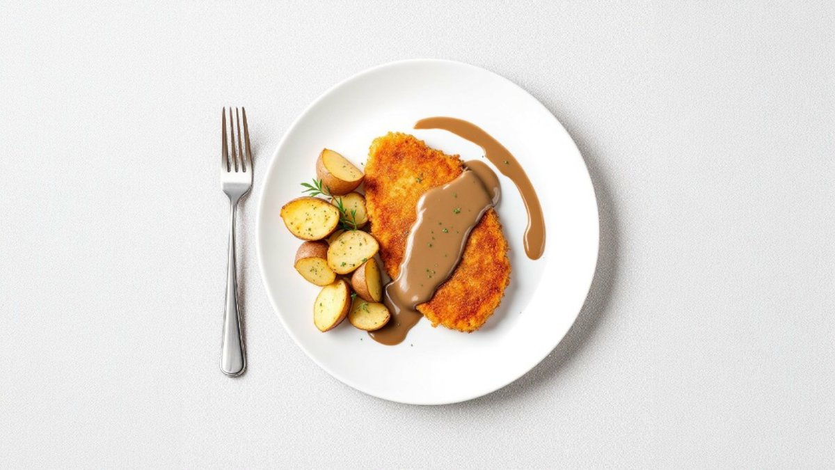 File de șalău în fulgi de porumb, cu sos de lămâie+ Cartofi natur
