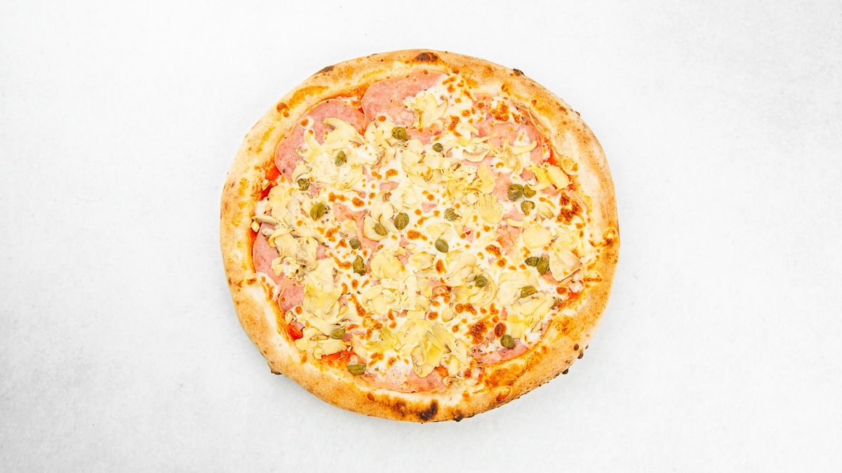 Blat pizza 32cm, sos de roșii condimentat, mozzarella, șuncă, ciuperci, măsline, ardei gras 500 g