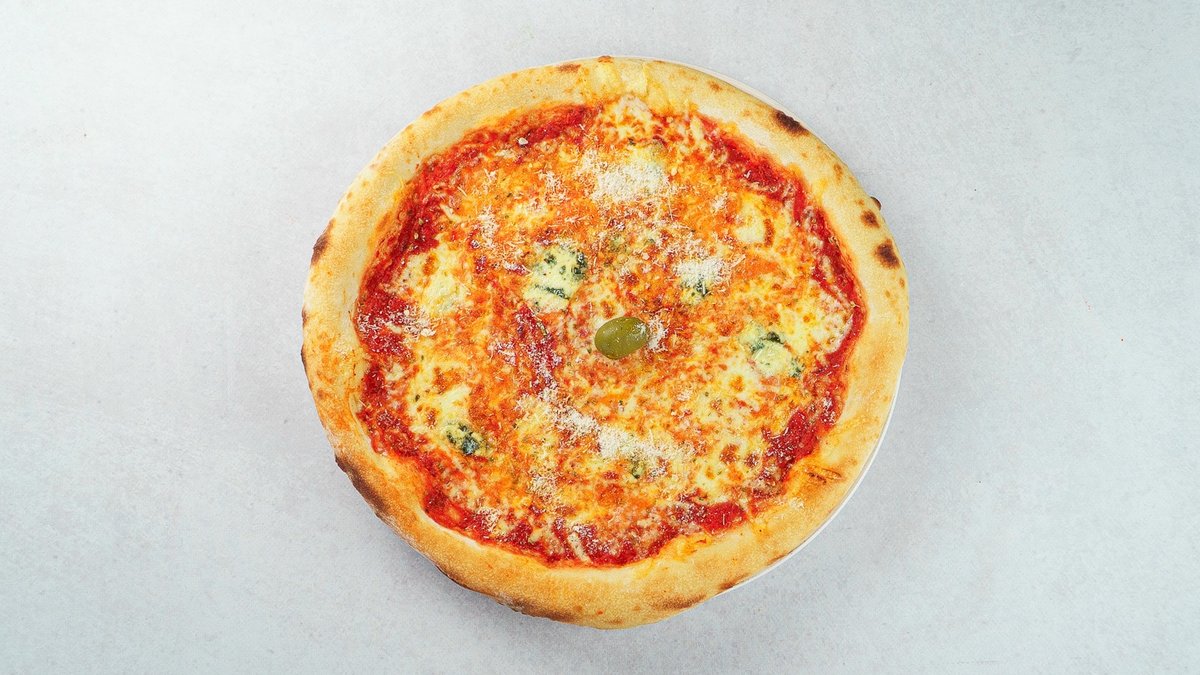 Blat pizza 32cm, sos de roșii condimentat, mozzarella, gorgonzola, telemea vacă (40%) , brânză cheddar 550 g