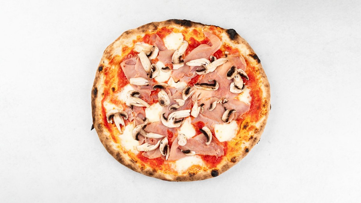 Blat pizza 32cm , sos de roșii condimentat,mozzarella,șuncă,ciuperci 500g