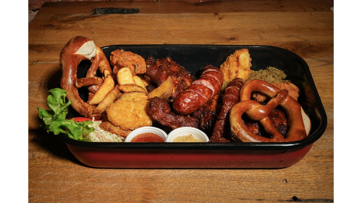 1/2 ribs, 2 chicken hot wings, 1 sausage, 1 little, wedges, stewed cabbage, coleslaw, pretzel, 2 dips, 1 craft beer 1/2 coastă, 2 aripioare de pui picante, 1 cârnat, 1 mic, wedges, varză călită, salată coleslaw, pretzel, 2 sosuri, 1 bere artizanală 1385g