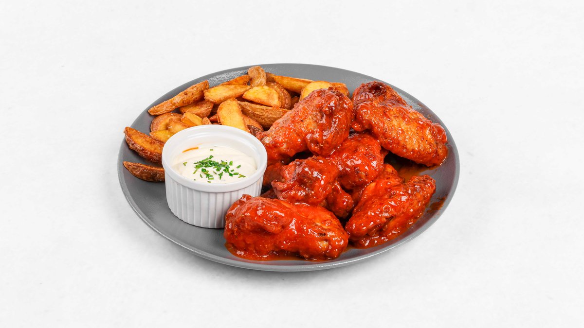 with wedges, coleslaw, pretzel and 2 dips Aripioare de pui picante în sos de miere, BBQ și susan cu wedges, salată coleslaw, pretzel și 2 sosuri 585g