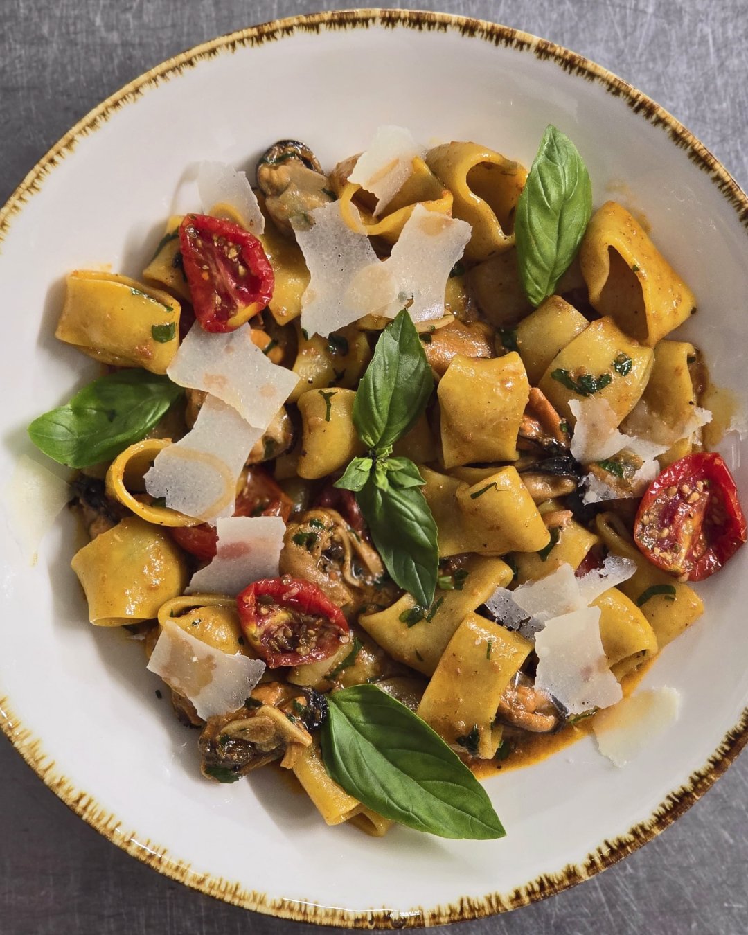 Paccheri de casa cu midii fara cochilie in sos de vin alb, rosii cherry deshidratate, carnati picanti Nduja si parmiggiano regiano, 350 g, produs picant