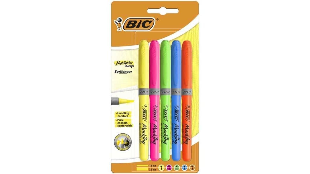Set 5 evidentiatoare BIC Highlighter Grip, varf mediu tesit, Multicolor