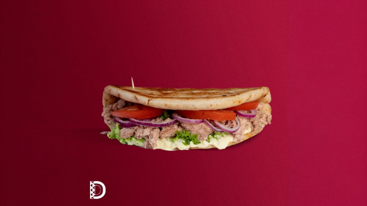 Pită grecească(120gr), ton(50gr), roșii(35gr), ceapă roșie(15gr), salată verde, sos maioneză de casă cu usturoi(50gr)
