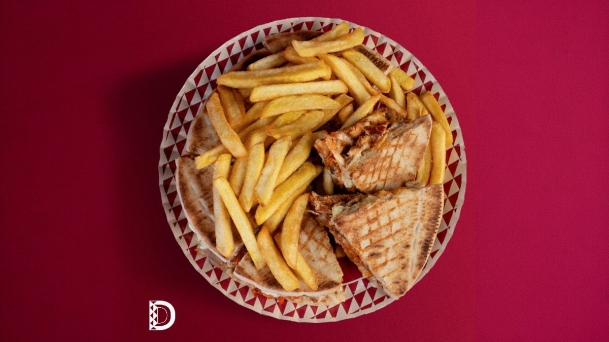 Pită grecească(100gr), telemea(100gr), cartofi prăjiți(50gr), roșii(35gr), ceapă(15gr), salată verde, maioneză de casă cu usturoi(50gr)