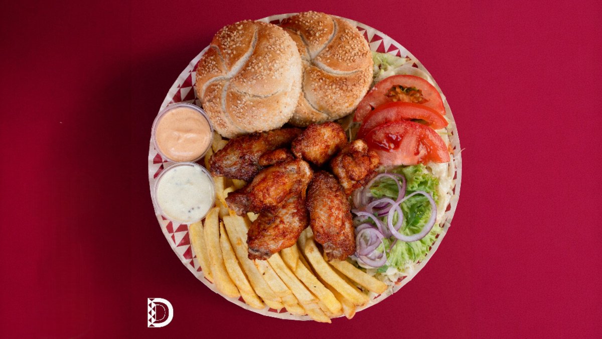 2 chifle cu susan(100gr), aripioare de pui(200gr), cartofi prăjiți(150gr), salată de varză(100gr), roșii(35gr), ceapă(15gr), sos picant(75gr)