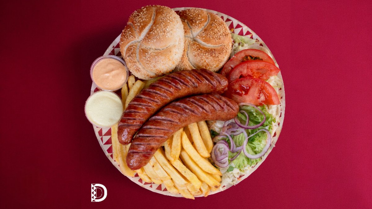 2 chifle cu susan (100gr), cârnați(200gr), cartofi prăjiți(150gr), salată de varză(100gr), roșii(35gr), ceapă(15gr), sos picant(75gr)