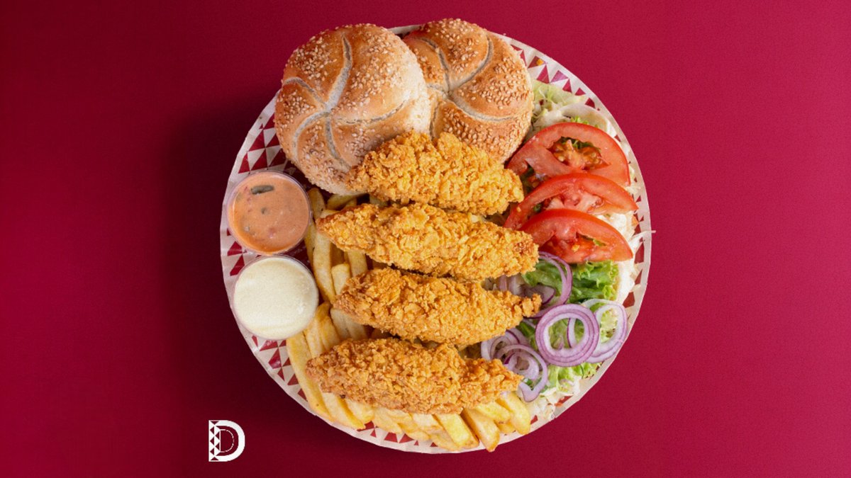 2 chifle cu susan(100gr), crispy de pui(200gr), cartofi prăjiți(150gr), salată de varză(100gr), roșii(35gr), ceapă(15gr), sos maioneză de casă cu usturoi(40gr), sos cocktail(40gr)