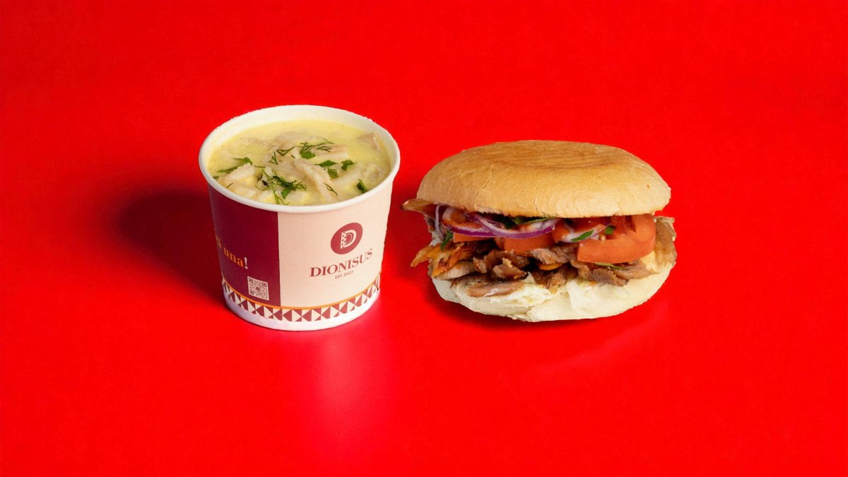Ciorbă rădăuțeană/burtă (320gr), chiflă cu susan (50gr) + Sandwich Gyros / Sandwich Dionisus (280gr)