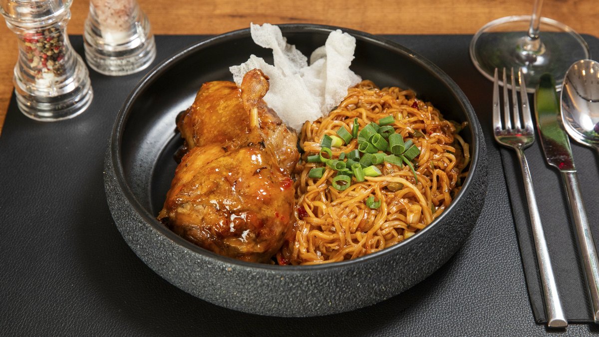 Jumătate de rață glasată cu reducție de portocale și grefe, servită cu noodles, sos soya și chilli 450 g
