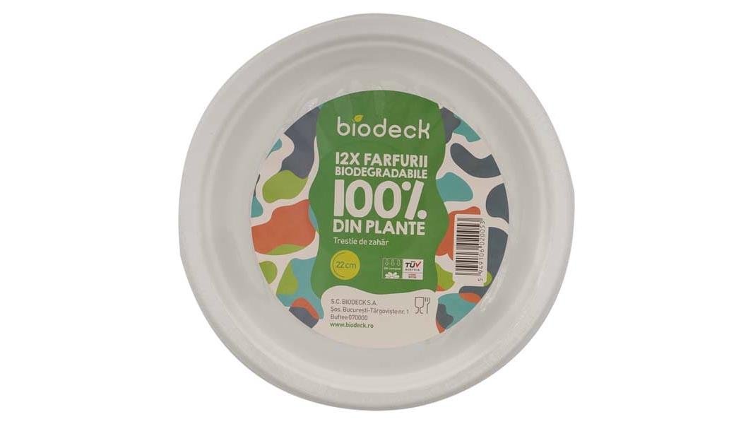 Set 12 farfurii biodegradabile Biodeck, trestie de zahar, 22 cm, Alb