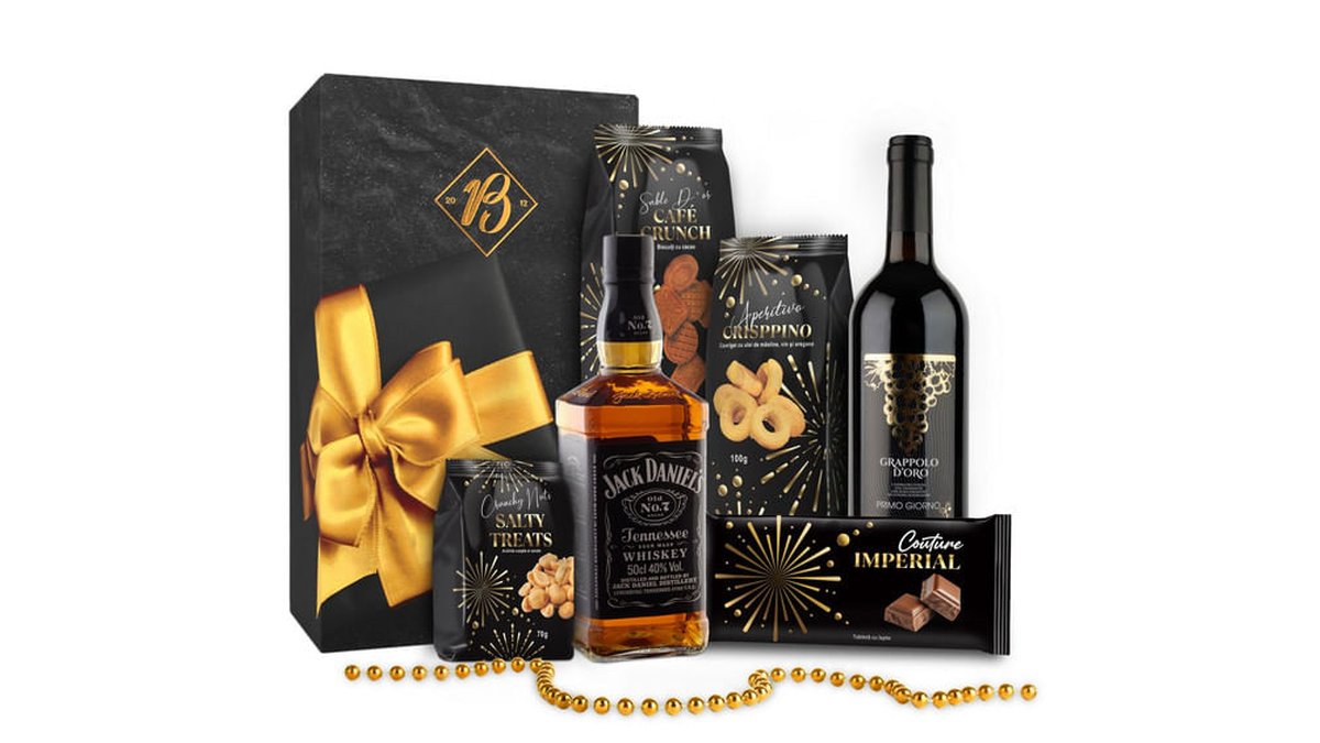 Cos pentru cadou Jack Gift, whisky Jack Daniel's, vin rosu Grappolo D'oro, si dulciuri