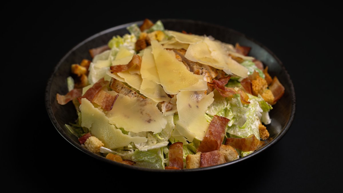 Piept de pui, pancetta, parmesan, salată iceberg, salată romană, dressing 300 g