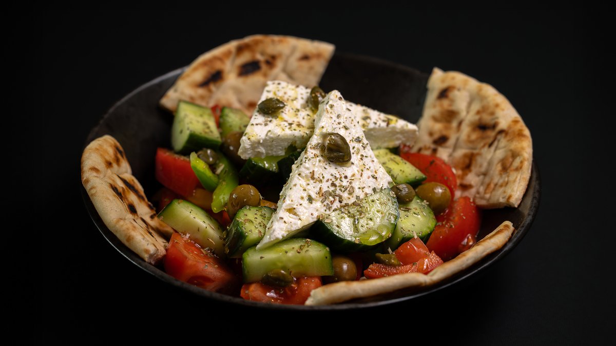 Piept de pui, pita greceasca, cartofi prajiti, salata greceasca, sos maioneza-mustar, patrunjel