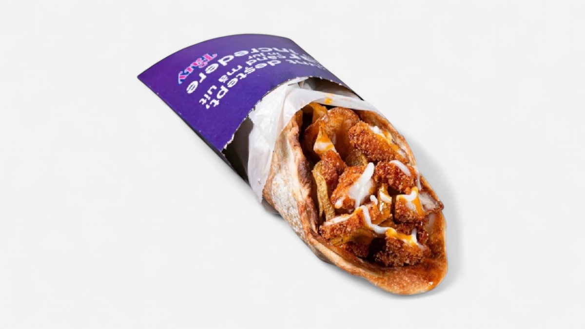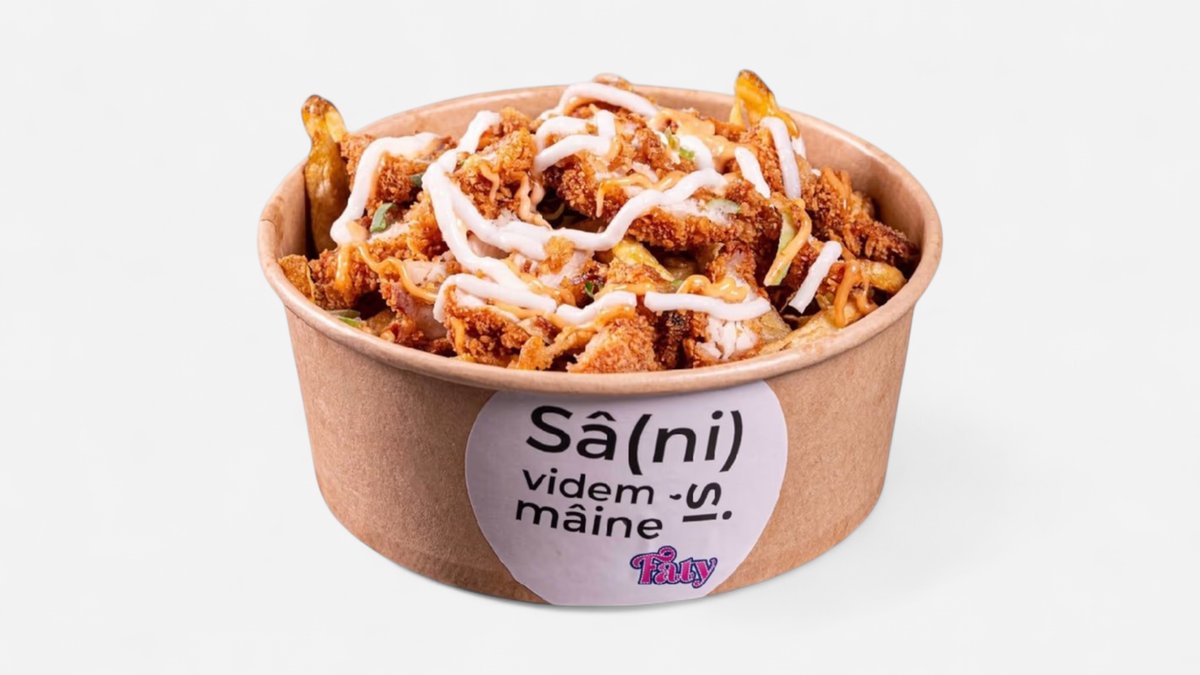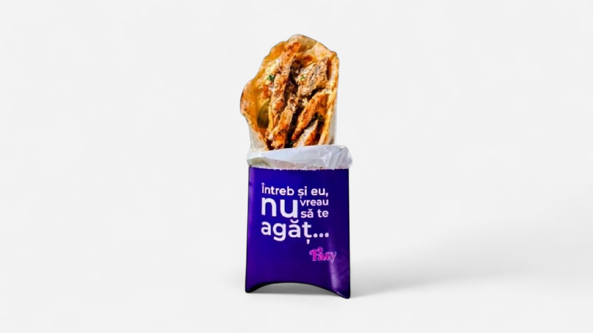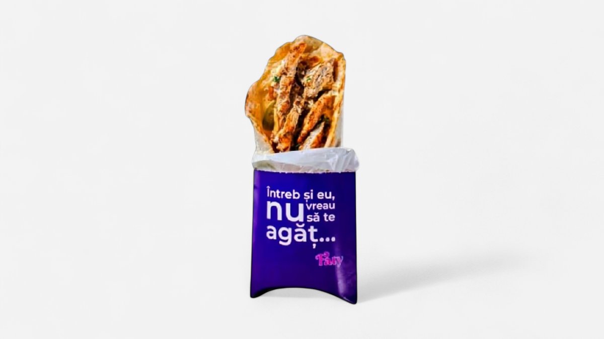 Faty, mai buna ca shaworma: lipie facuta in casa, crispy pui, mozzarella, chips cartofi, ardei copt, jalapeno, pătrunjel cu usturoi, ceapă verde, castraveți murați, chili mayo, sos usturoi. 350 g