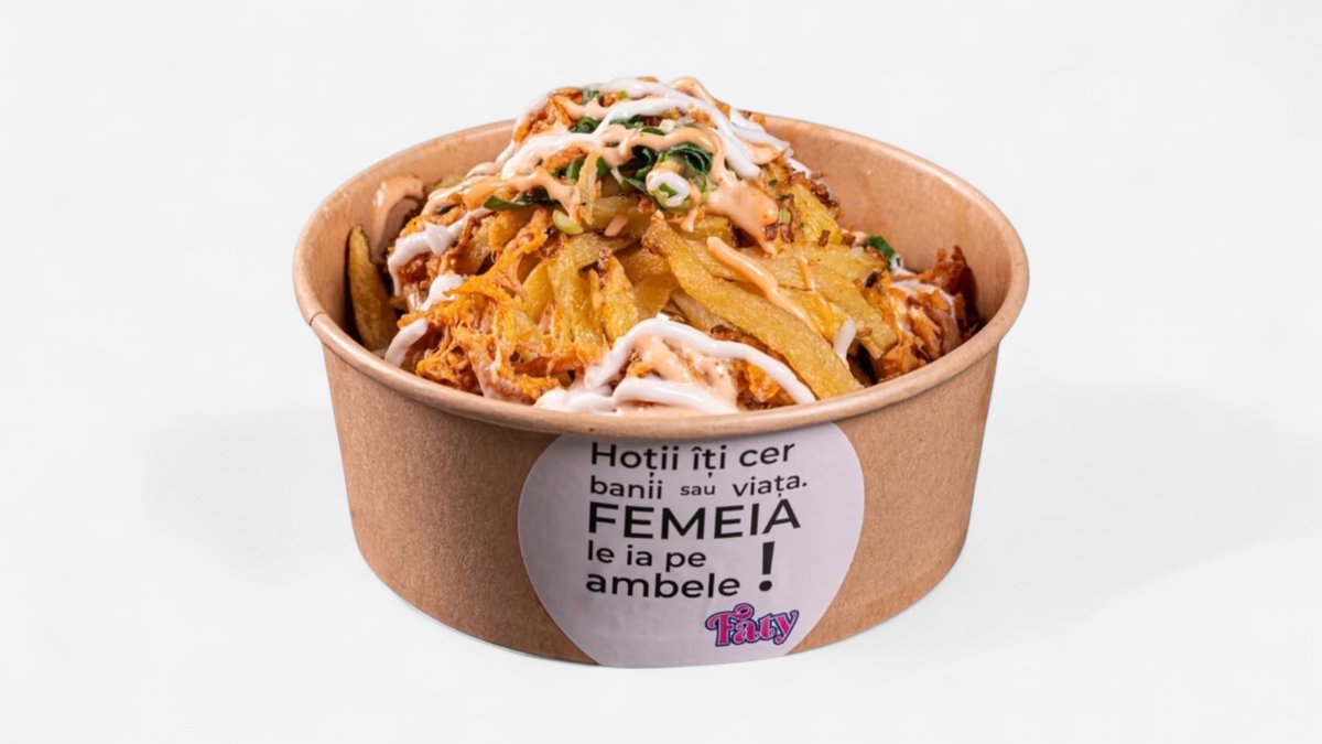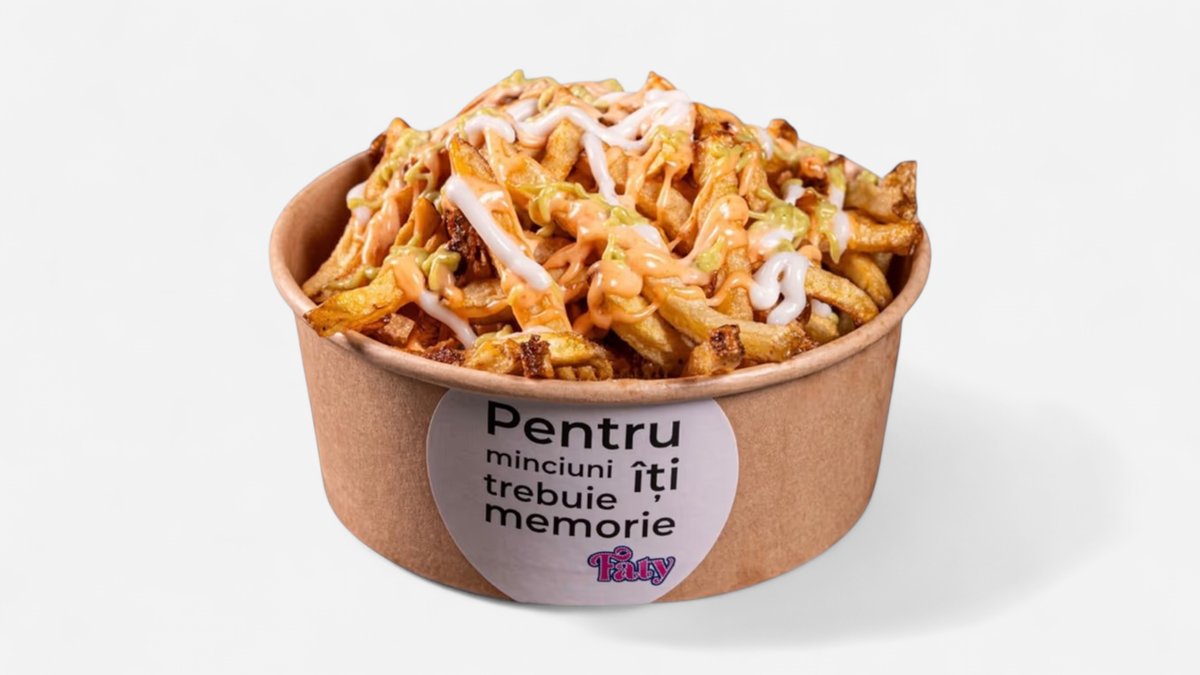 Faty, mai buna ca shaworma: lipie facuta in casa, pulled pork, mozzarella, chips cartofi, ardei copt, jalapeno, pătrunjel cu usturoi, ceapă verde, castraveți murati, chili mayo, sos usturoi, ceapă cispy. 350 g