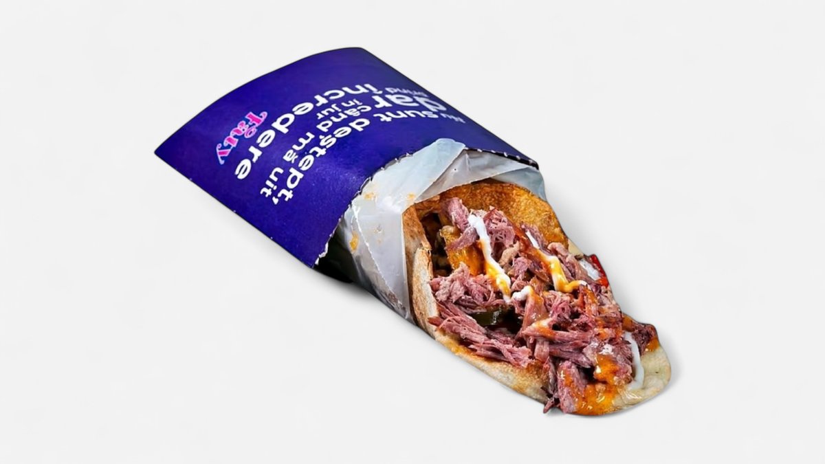 Faty, mai buna ca shaworma: lipie facuta in casa, pulled beef, mozzarella,chips, cartofi, ardei copt, jalapeno, pătrunjel cu usturoi, ceapă verde, castraveți murați, chili mayo, sos usturoi. 350 g