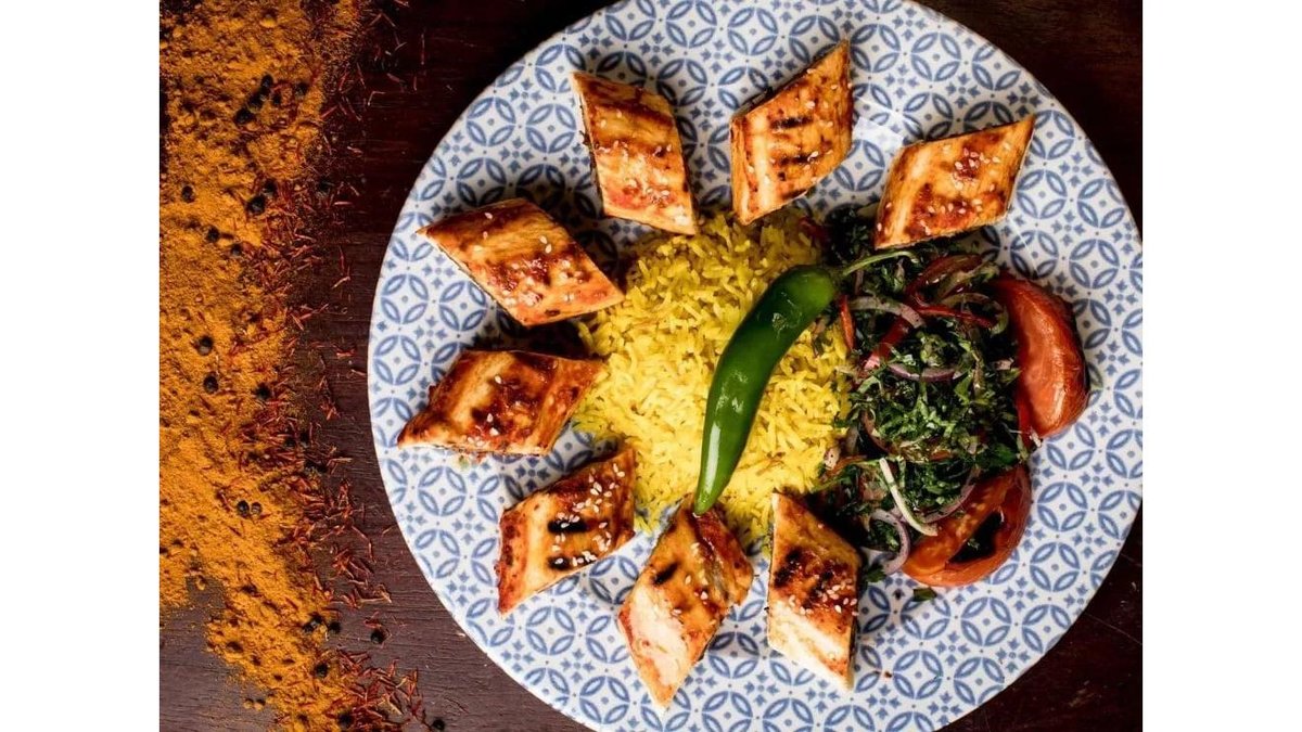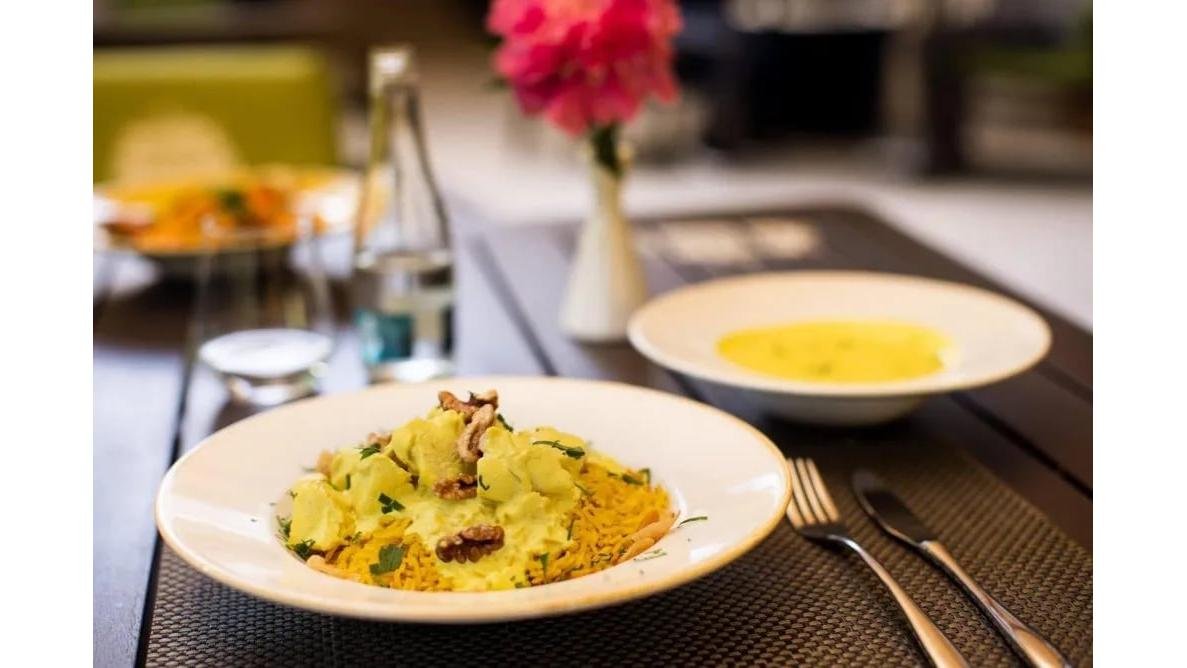 Carne de pui, orez, lipie prăjită, miez de nucă, sos iaurt și curry 100/130/100 g
