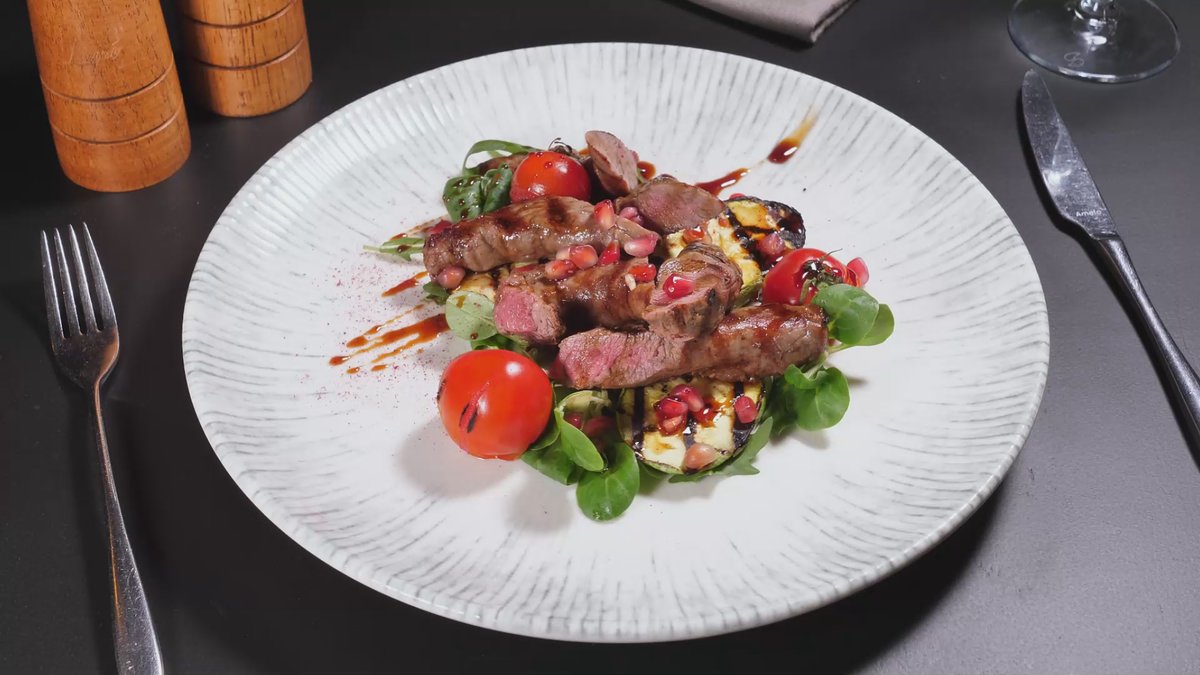 Piept de rață, piure de țelină, dulceață de roșii cherry 250/ 100 g