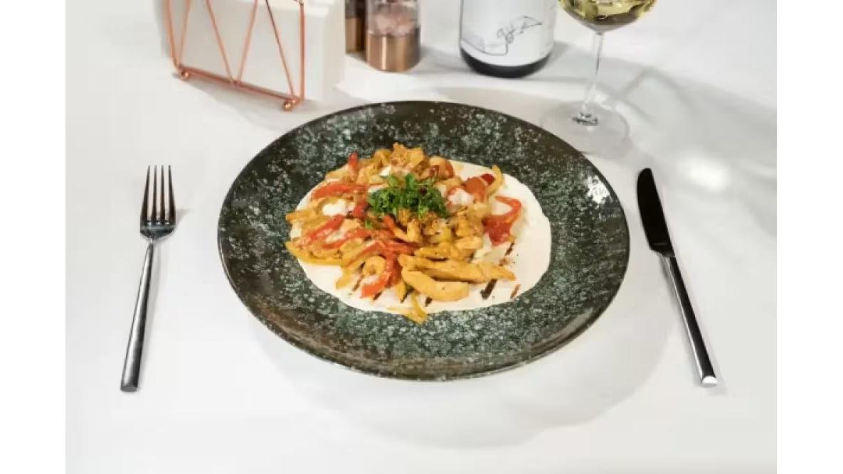 Piept de pui fașii, ceapă, ardei gras, sos chilly, cașcaval 170/100 g