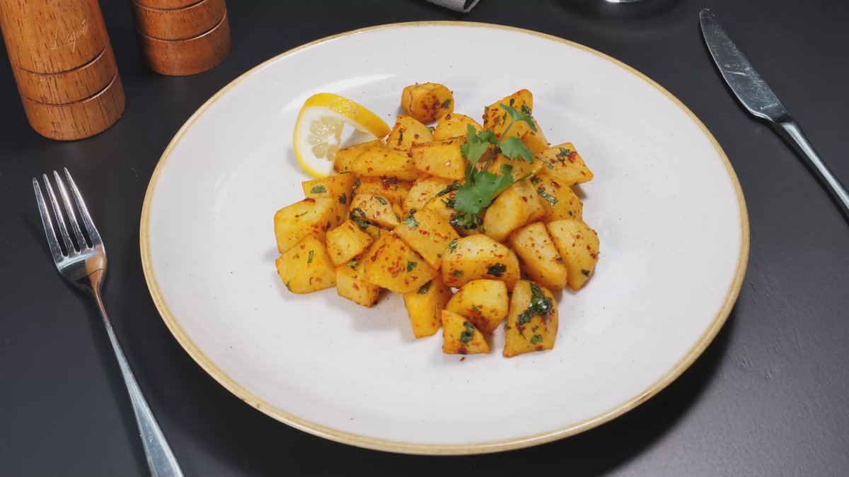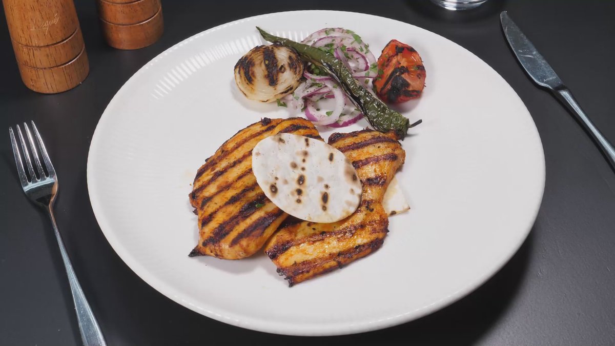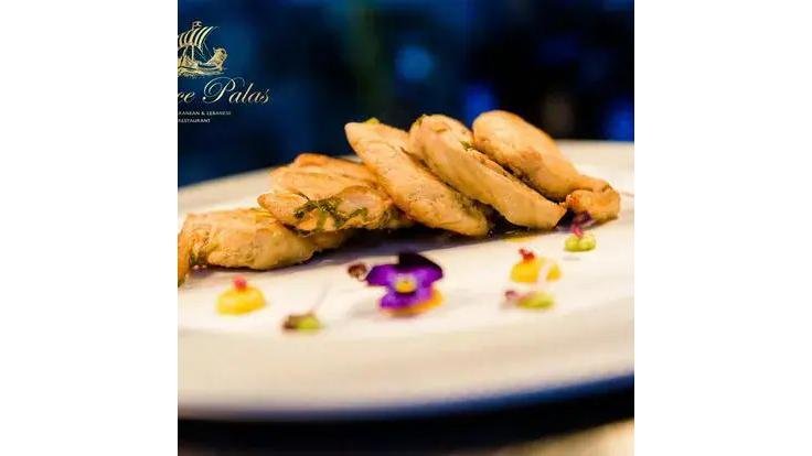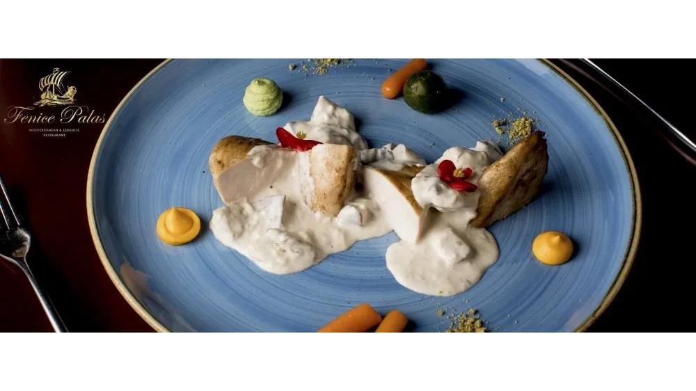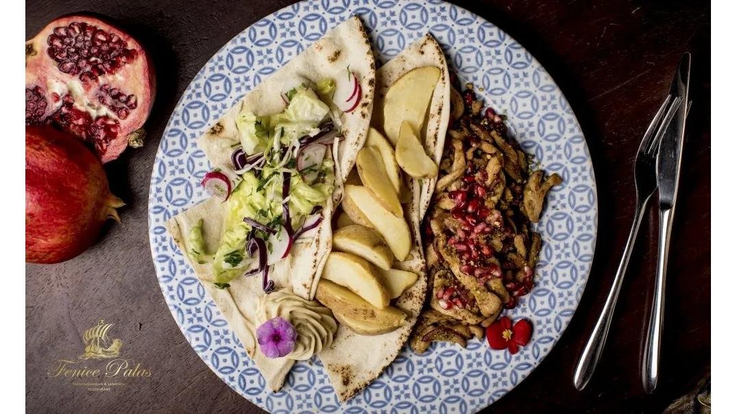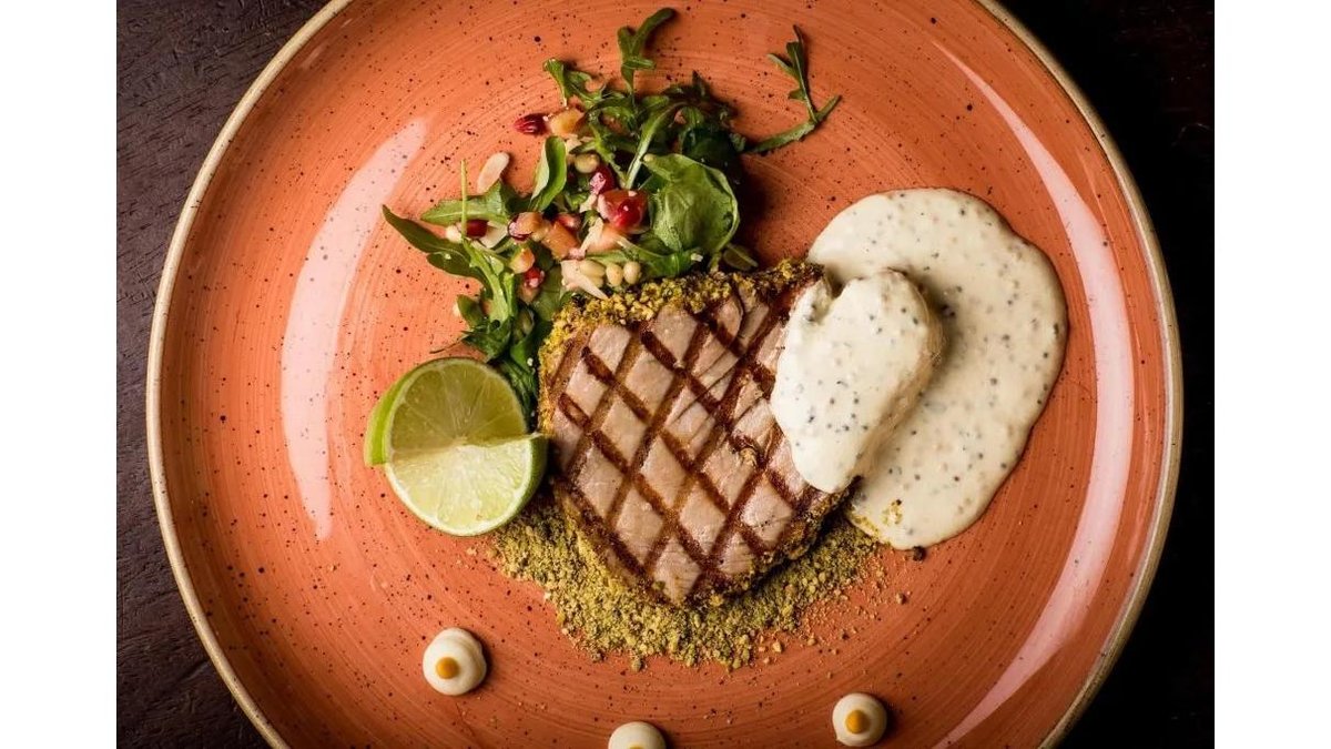 Piept de pui cu fistic, sos de rodii, ceapă roșie, cartofi prăjiți, hommous, salată mixtă 150 / 100 / 100 g