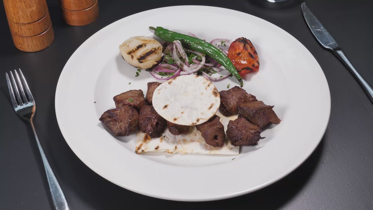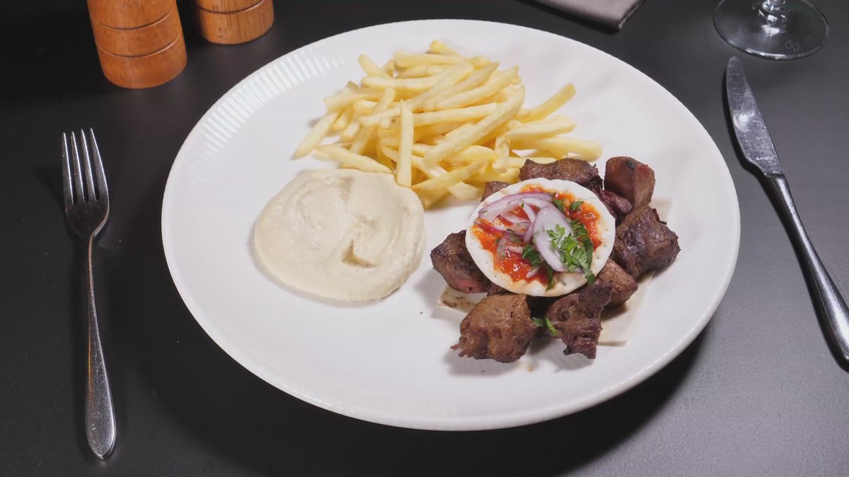 Frigărui de vită, hummus, cartofi prăjiți, salată arabească 200 /200 g