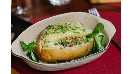 Cartof intreg la cuptor, unt, maioneza, branza de capra, parmezan