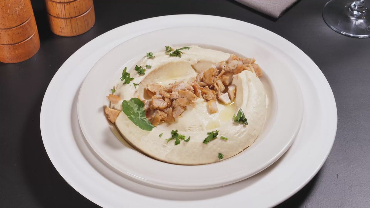 Pastă de năut, sos tahina, carne de pui, lămâie, ulei de măsline, 50/150 g