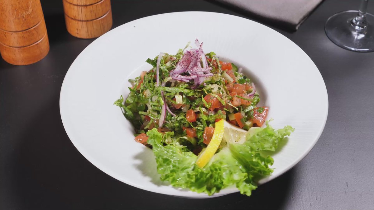 Salată de vinete, sos tahina, usturoi, roșii, ceapă, 150 g