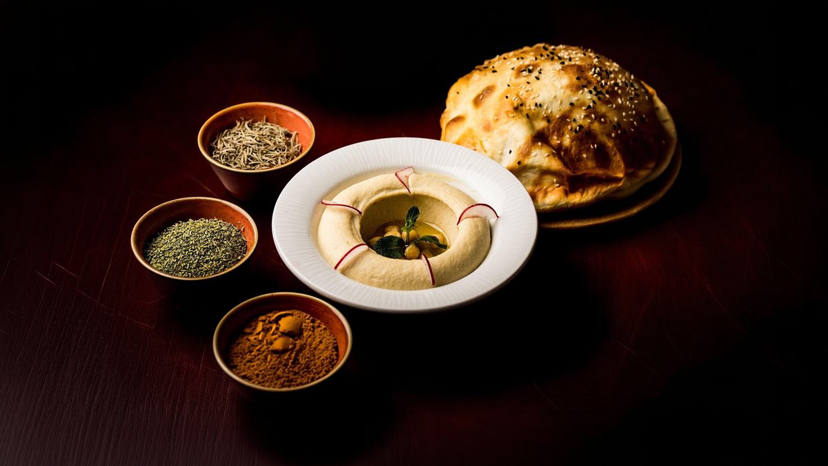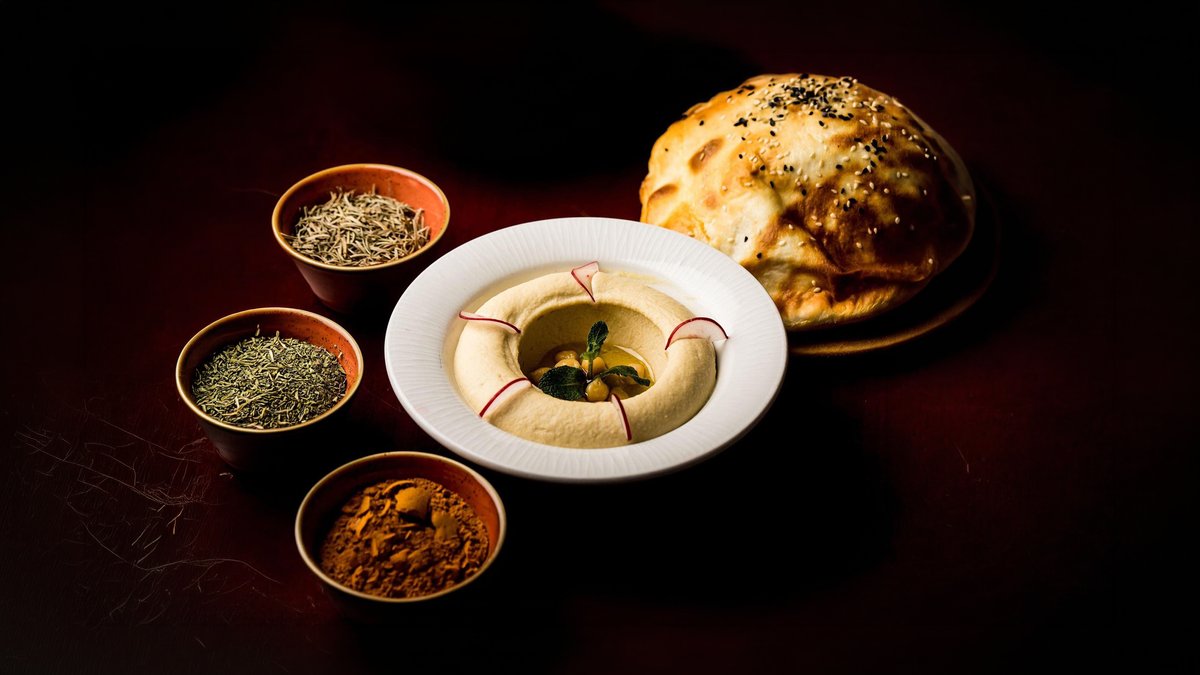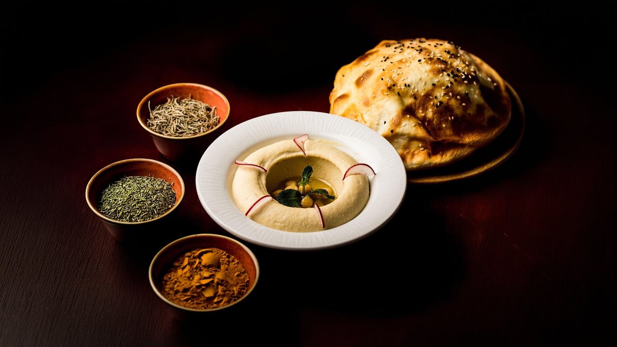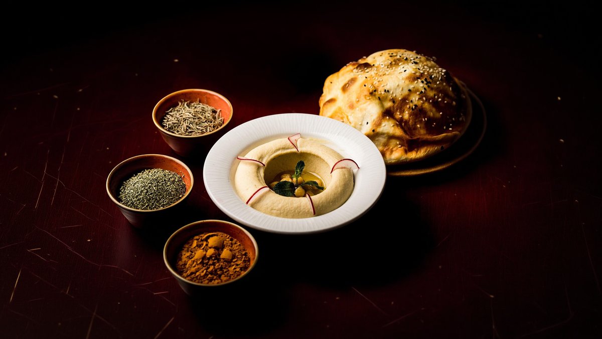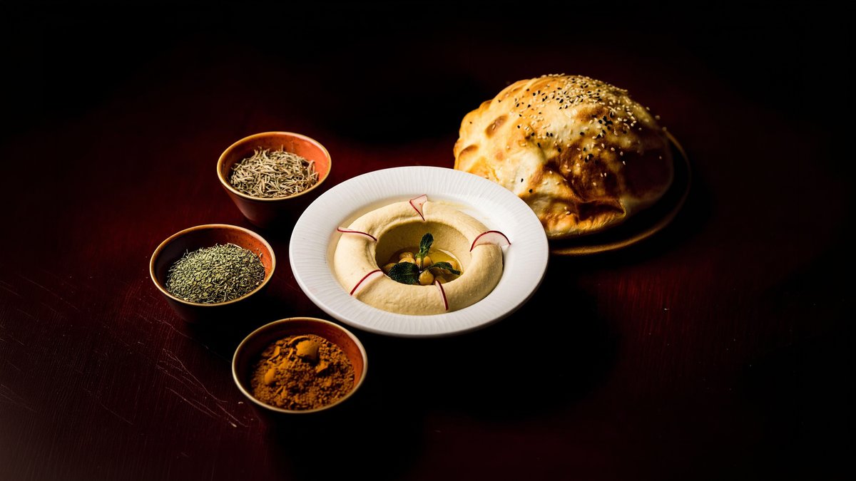 Pastă de năut, sos tahina, carne de vită, muguri de pin, lămâie, ulei de măsline, 50/20/150 g