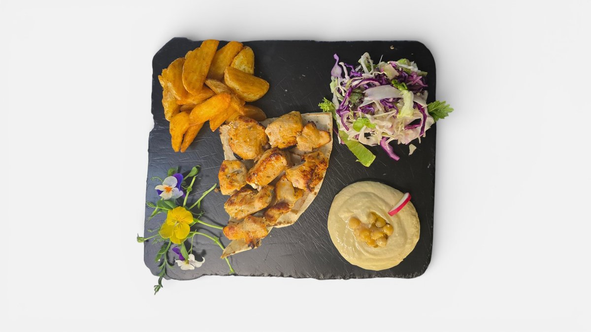 Kebab de pui, hummus, salată arabească, cartofi prăjiți 240 /200 g