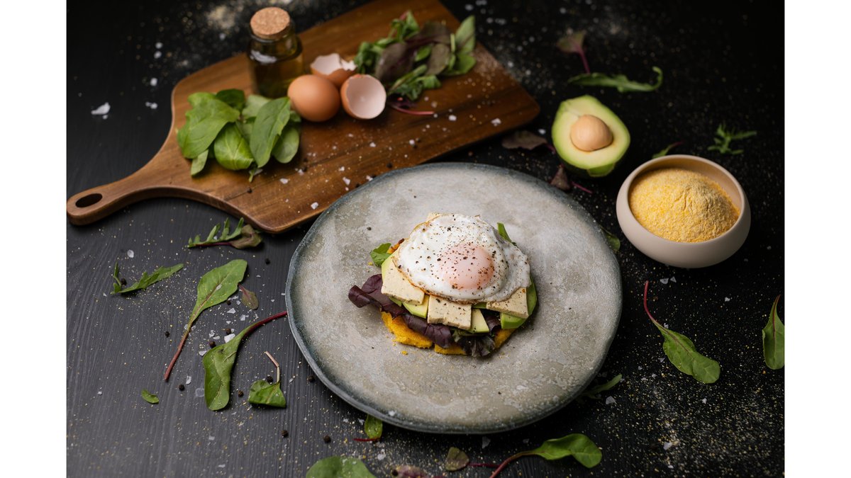 Arepas cu avocado, tofu afumat și ou ochi moale