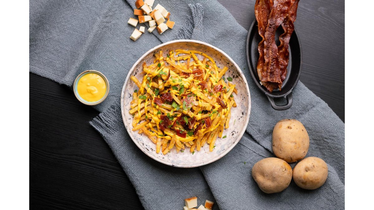 Cartofi prăjiti cu sos cheddar, bacon și pesto de pătrunjel cu usturoi și parmezan