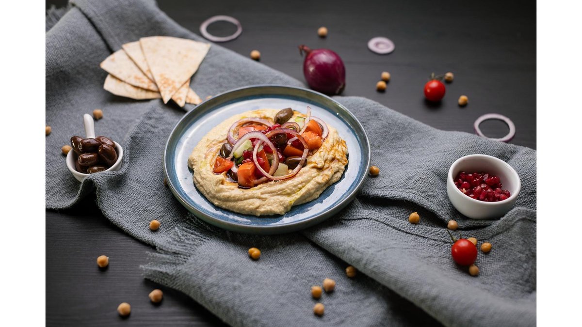 Hummus de năut cu măsline Kalamata, legume marinate, melasă de rodii și ulei cu busuioc