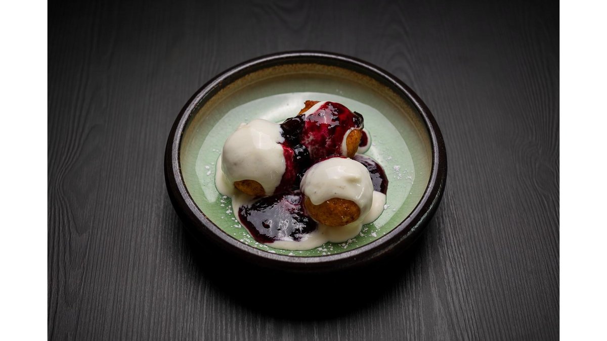 Papanași pufoși și aurii, serviți cu o dulceață bogată de afine și un sos acrișor de smântână 150g