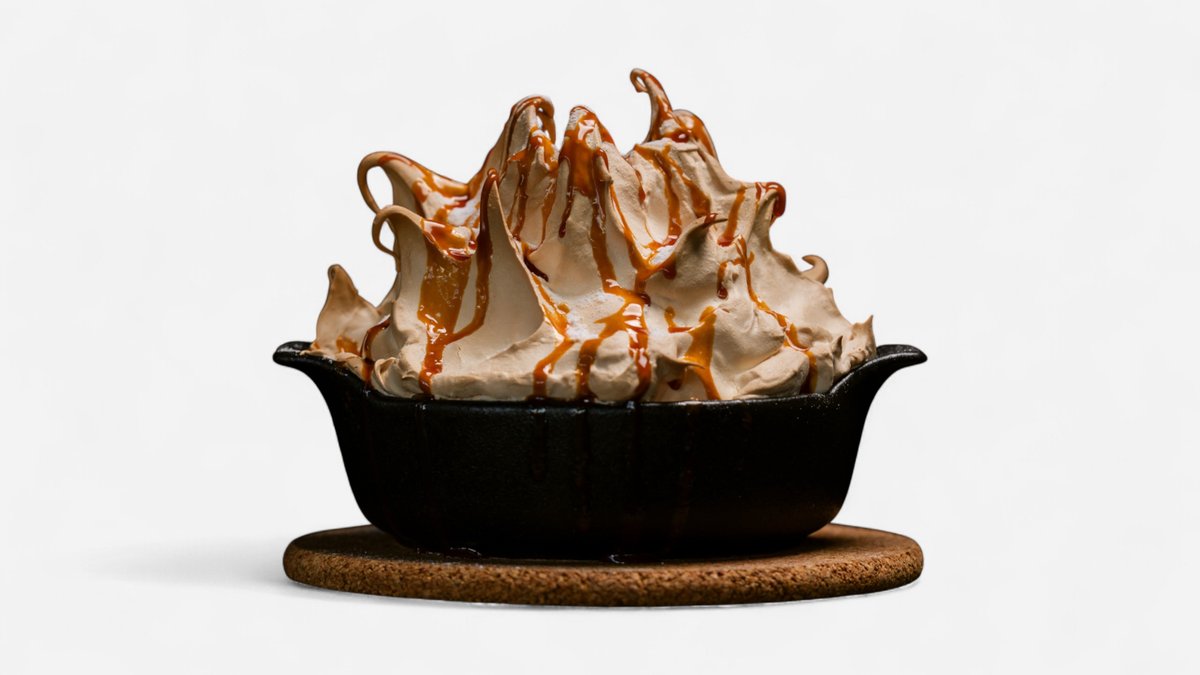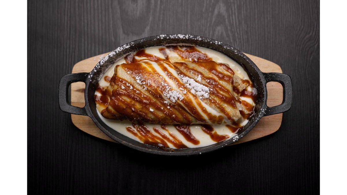Rulouri de clătite umplute cu brânză dulce și stafide, acoperite cu un sos fin de vanilie și spumă de ou rumenită ușor la cuptor, totul asezonat cu zahăr pudră și un topping generos de caramel