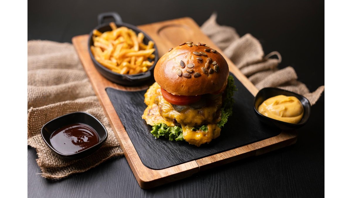 Chiflă cu semințe de dovleac, burger de vită, cașcaval cheddar, roșie, salată lollo bionda, ceapă roșie, castraveciori murați și sosuri 450g Conține produs din produs congelat