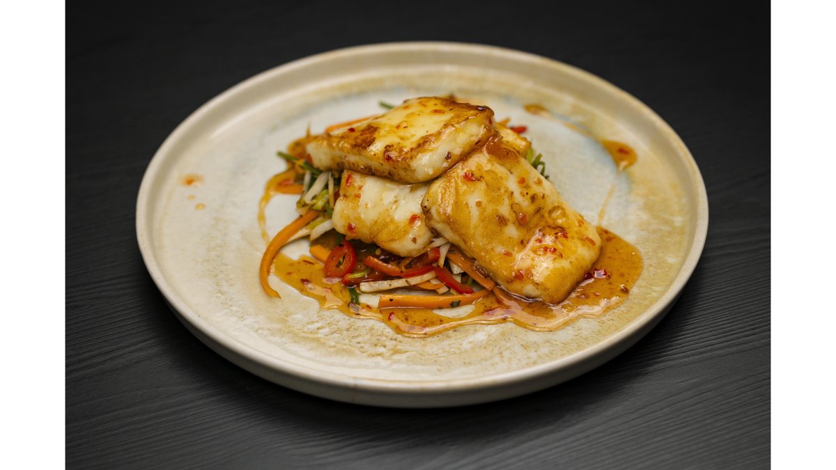 Halloumi cu fâșii de legume și sos de miere cu fulgi de chili