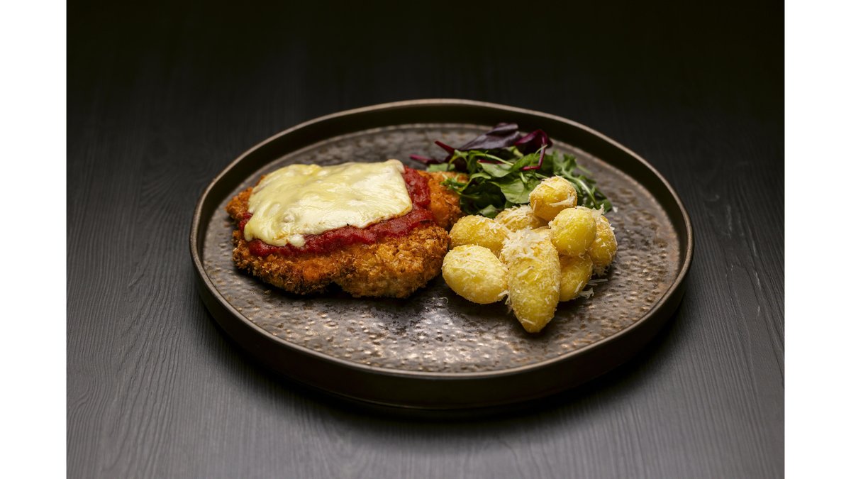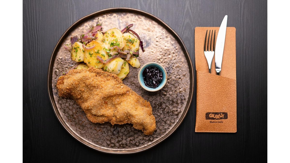 Snițel Uriaș de vită cu salată de cartofi si dulceață de ceapă roșie cu vin