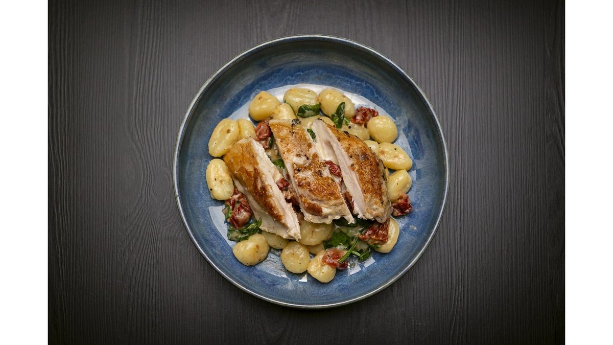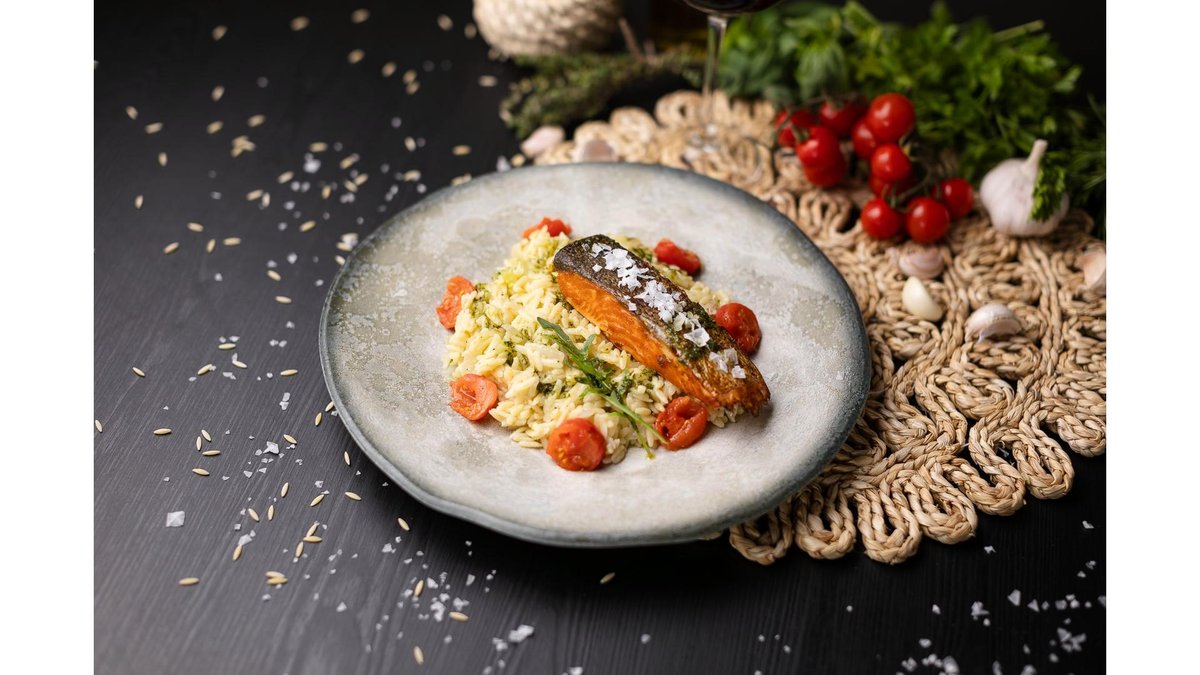 Somon la cuptor, orzo cu parmezan, roșii cherry coapte și pesto de verdețuri