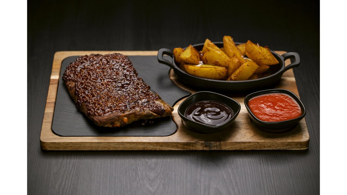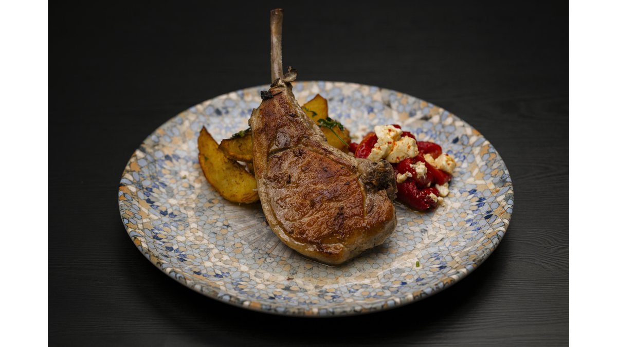 Tomahawk de porc cu cartofi wedges cu usturoi și salată de ardei copt cu feta