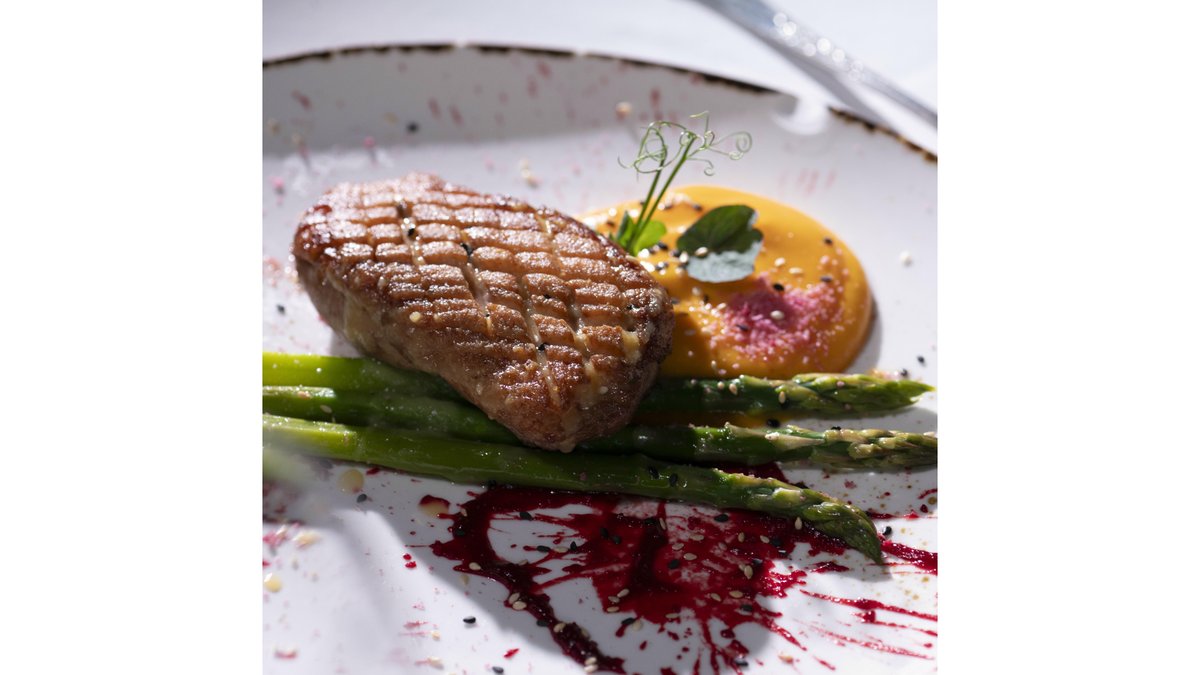 Piept de rață cu sos de portocale, piure de dovleac copt, broccoli și dulceață de sfeclă cu hrean – 600 gr
