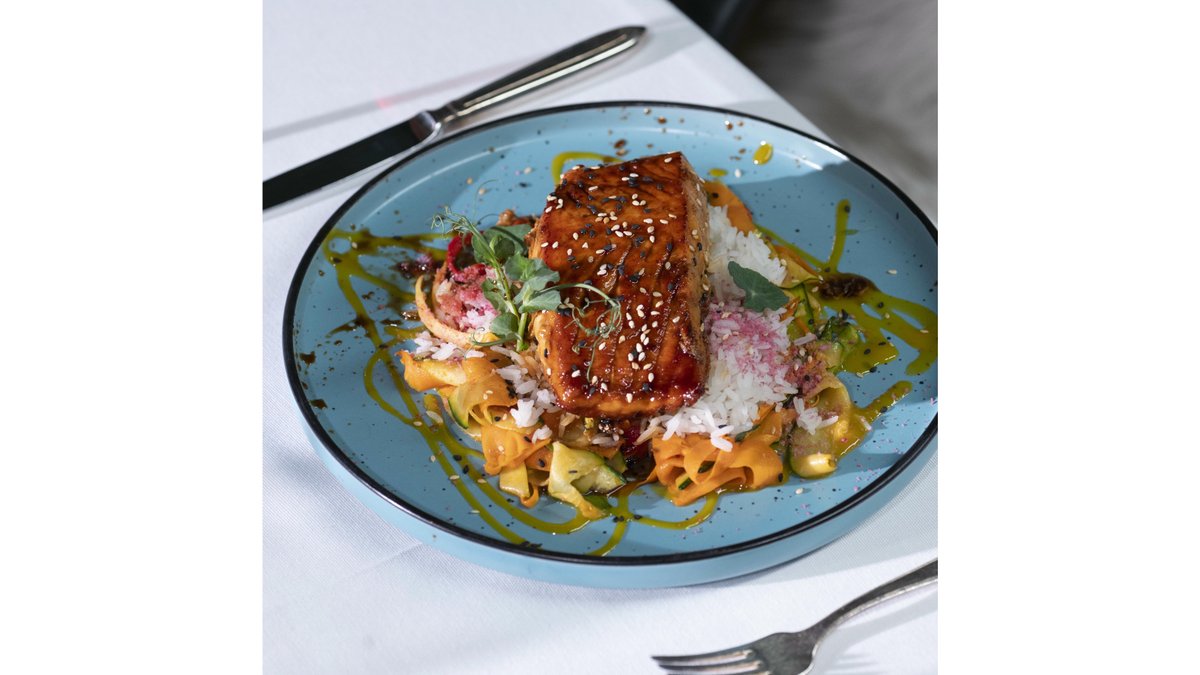 Somon teriyaki cu tagliatelle de legume și piure de mango – 500 gr