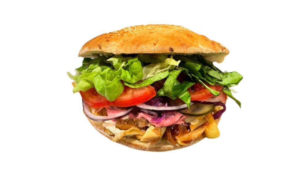 Carne pui 120g, cartofi prăjiți 50g, salată verde 10g, salată de varză 30g, ceapă roșie 10g, roșii 10g, castraveți murați 20g, sos usturoi 50g, sos krass 30g, sos ketchup 30g, sos tzatziki 20g, sos sfeclă 30g, chiflă 140g. 550g
