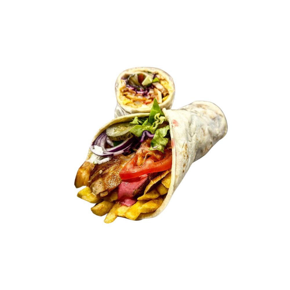 Carne pui 60g, carne vițel 60g, cartofi prăjiți 50g, salată verde 10g, salată de varză 30g, ceapă roșie 10g, roșii 20g, castraveți murați 10g, sos usturoi 20g, sos Krass 20g, sos ketchup 20g, sos tzatziki 20g, sos sfeclă 20g, lipie 100g. 450g