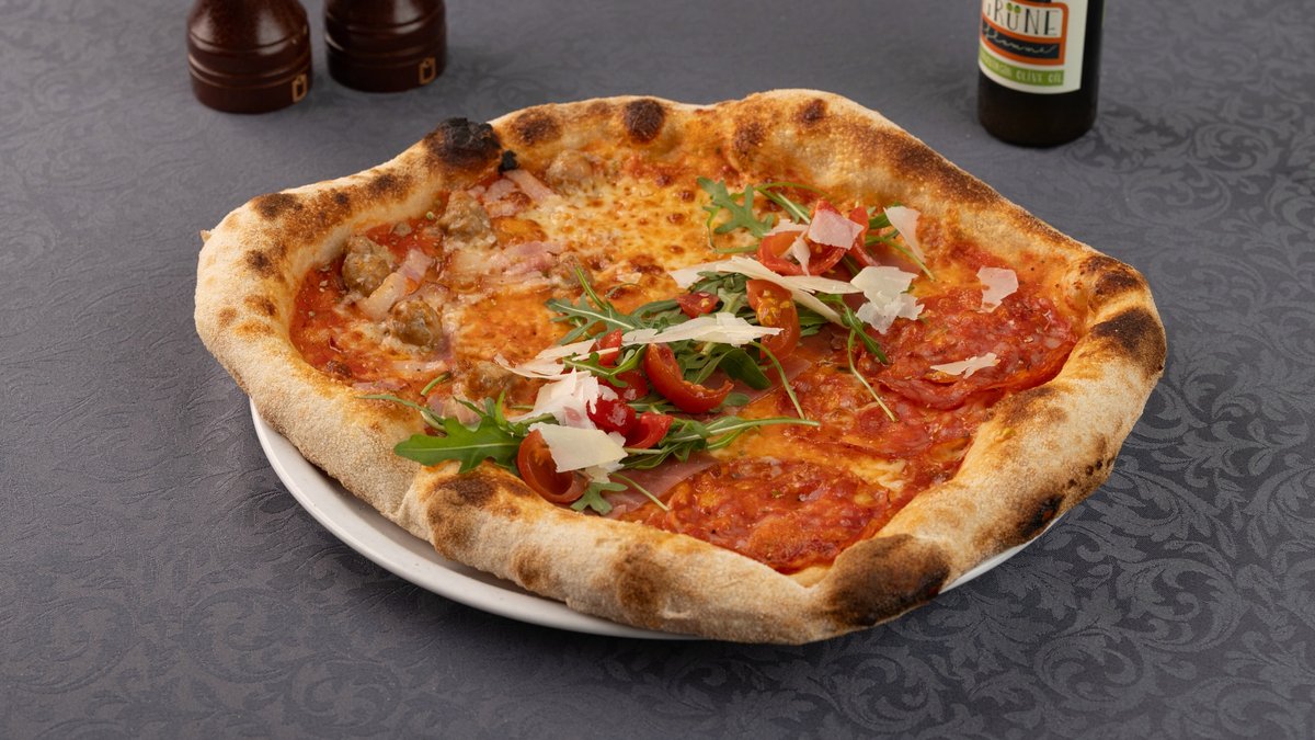 Sos roșii, mozzarella, salam picant, sos ragu, prosciuto crudo, rucolă, roșii cherry, parmezan, panceta